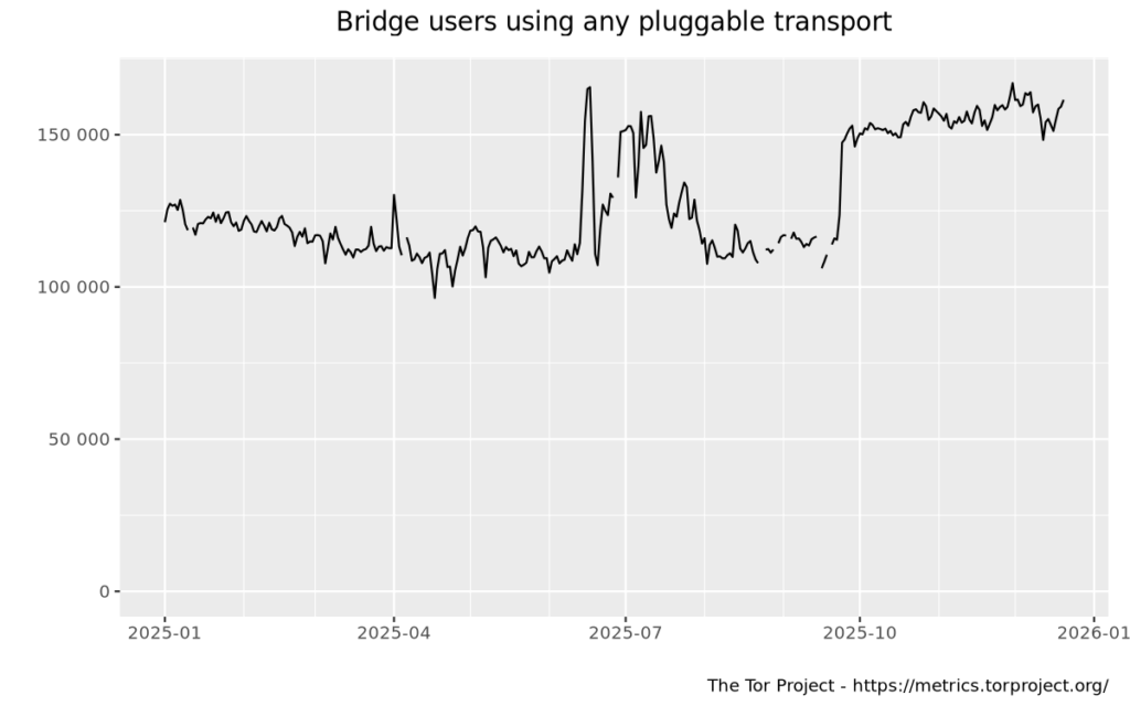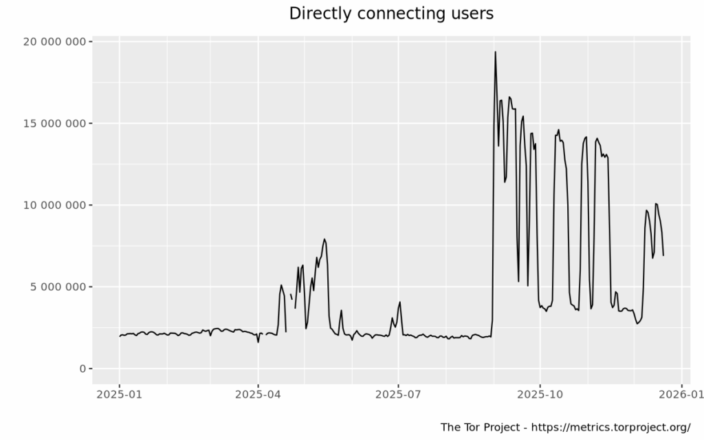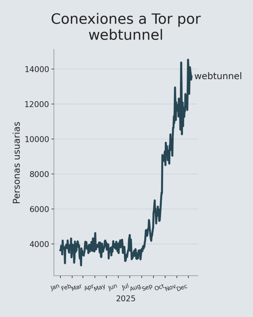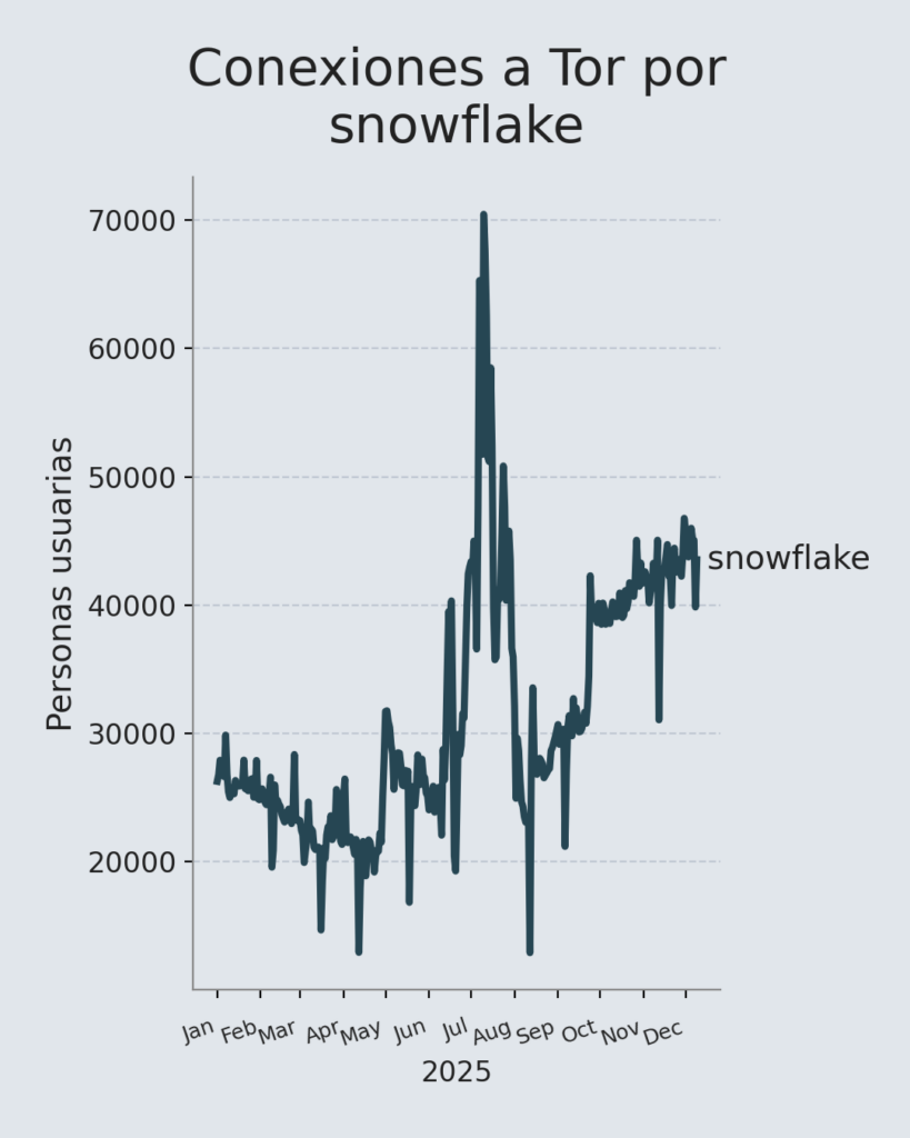 Durante el año, la red Tor registró picos máximos que, a partir de inferencias estadísticas, sitúan entre 7,9 y 19,3 millones de personas usuarias conectadas directamente a la red, mientras que unas 166,9 mil lo hicieron por medio de puentes.