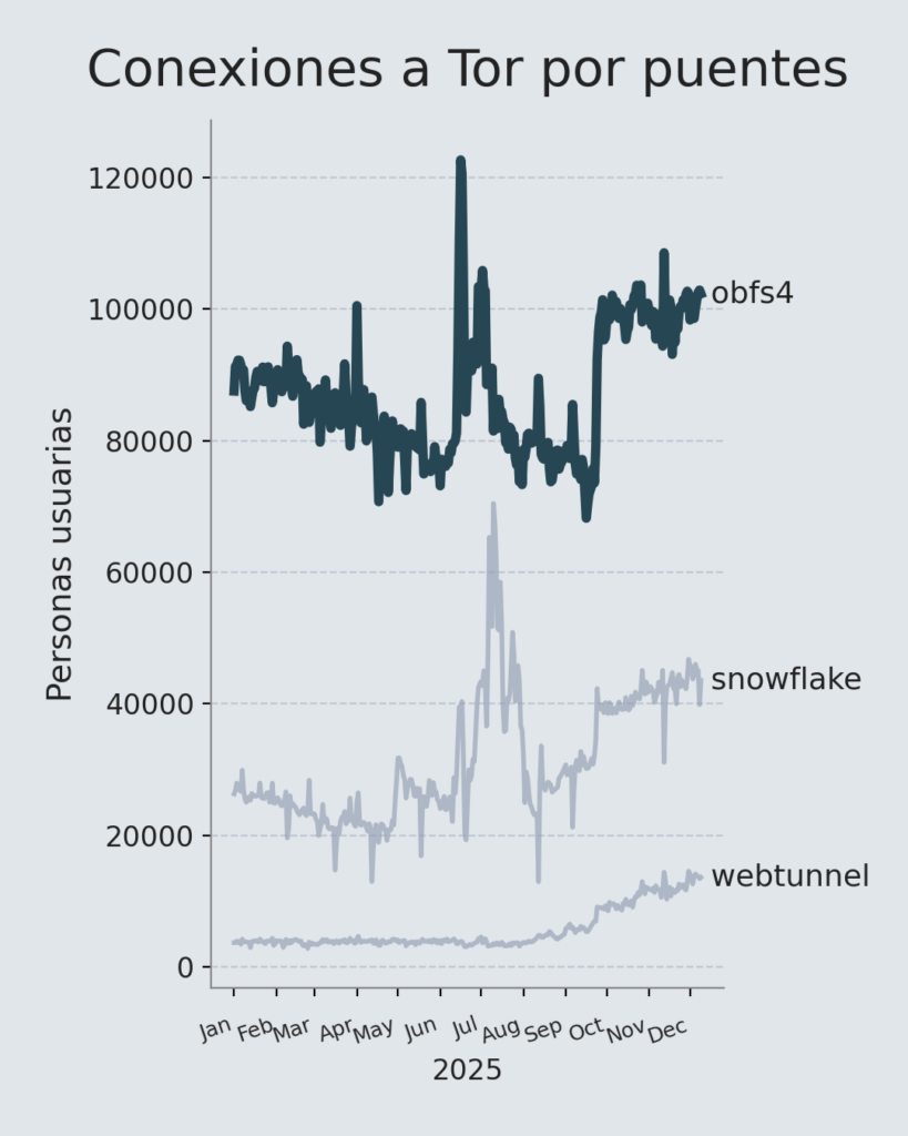 A lo largo del año, la arquitectura de los principales puentes como Snowflake, 0bfs4 y Webtunnel permitió sostener y redistribuir el tráfico ante bloqueos de la red. Datos históricos del Tor Project y gráficas de Acuarela Taller.